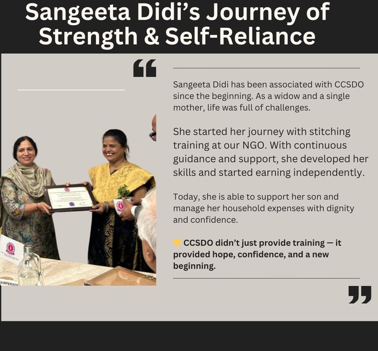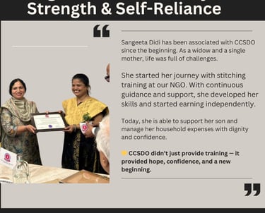 CCSDO was born from the determination of a woman who grew up in a community where even stepping out to work was a struggle for many women. Watching girls drop out early, families facing daily hardships, and silence around basic needs created a constant thought — something has to be done.