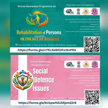 CCSDO collaborated in a two-day Virtual Awareness Programme on Social Defence Issues and Rehabilitation of Persons Engaged in Begging, organized in association with the National Institute of Social Defence (NISD) and APSWDP. The initiative aimed to promote awareness and dialogue on key social defence concerns, which include protection and welfare of vulnerable groups such as marginalized communities, elderly persons, and individuals affected by social exclusion. Social defence programmes focus on strengthening community support systems and improving policies that safeguard dignity and social justice.
