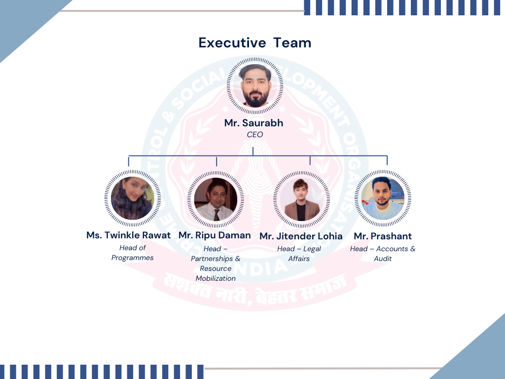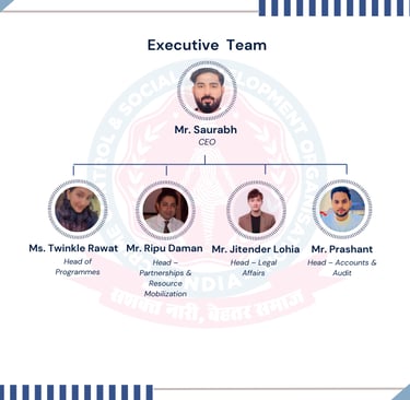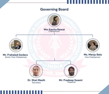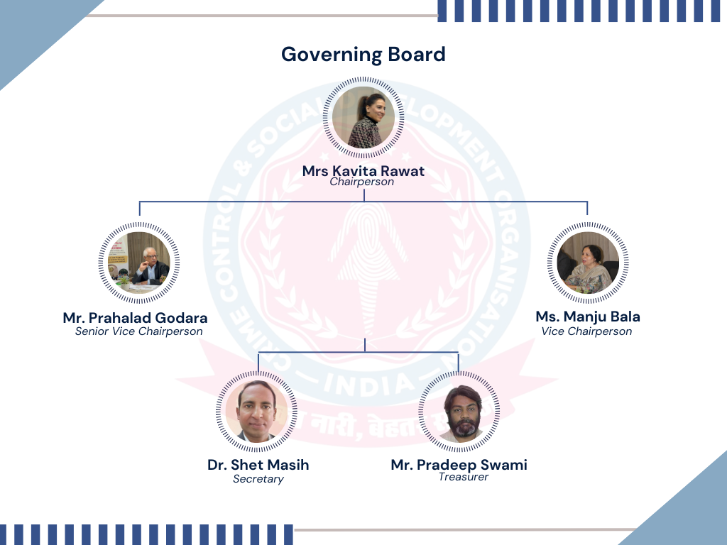 At CCSDO (Crime Control & Social Development Organisation), our strength lies in the collective vision, dedication, and leadership of a diverse group of individuals who are deeply committed to social change. The organization is guided by an experienced Governing Board, Advisory Members, and a Dynamic Executive Team who bring together expertise from the fields of social development, law, policy, community engagement, youth empowerment, and organizational management.